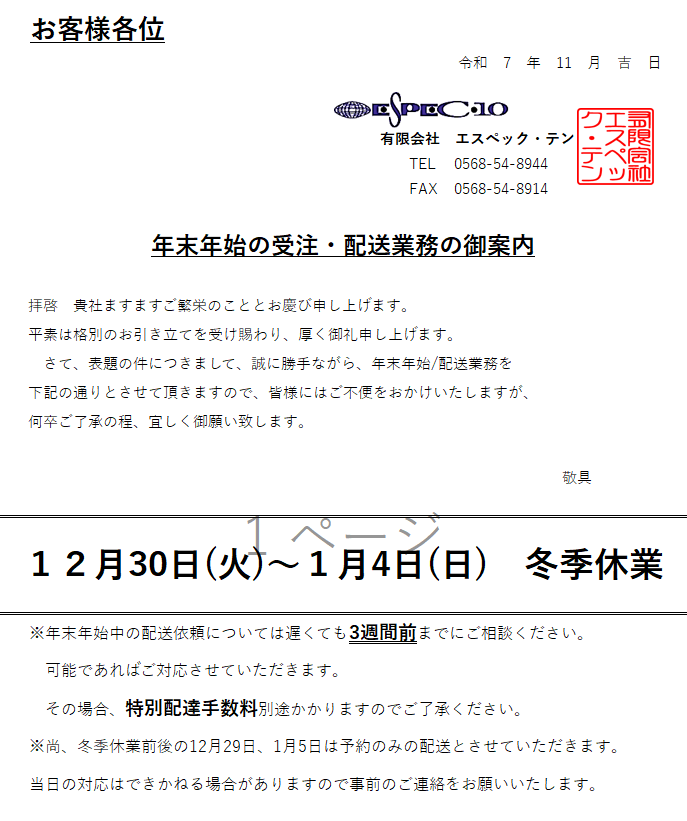 弊社年末年始休業日に関しまして下記のとおりご案内させていただきます。